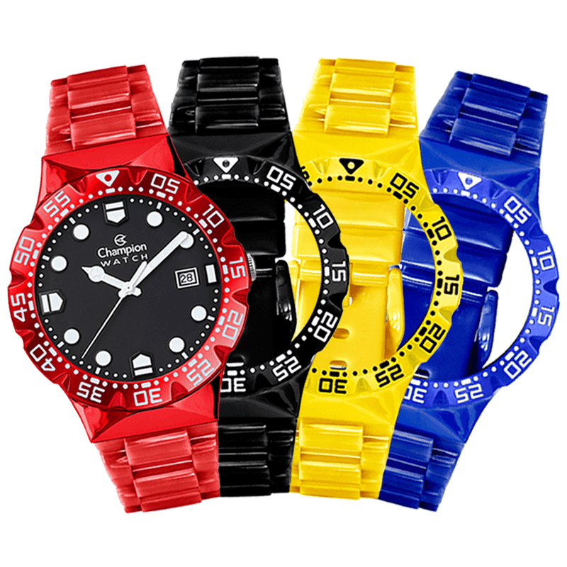Champion Troca Pulseirasvem com uma caixa metálica de 42mm e 4 pulseiras de plástico em cores incríveis, para você variar e combinar com qualquer look e ocasião.
