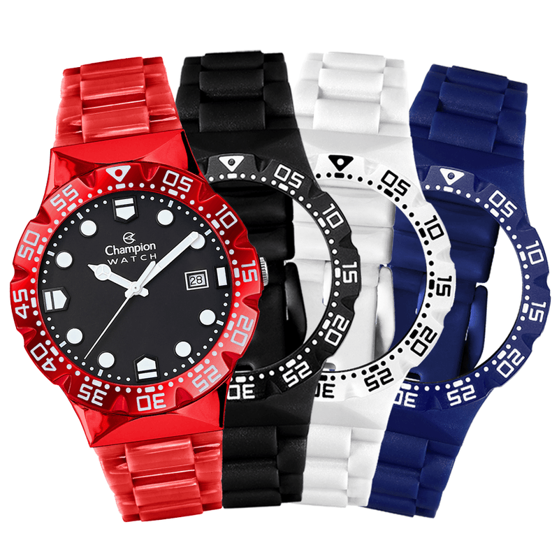 Champion Troca Pulseirasvem com uma caixa metálica de 42mm e 4 pulseiras de plástico em cores incríveis, para você variar e combinar com qualquer look e ocasião.